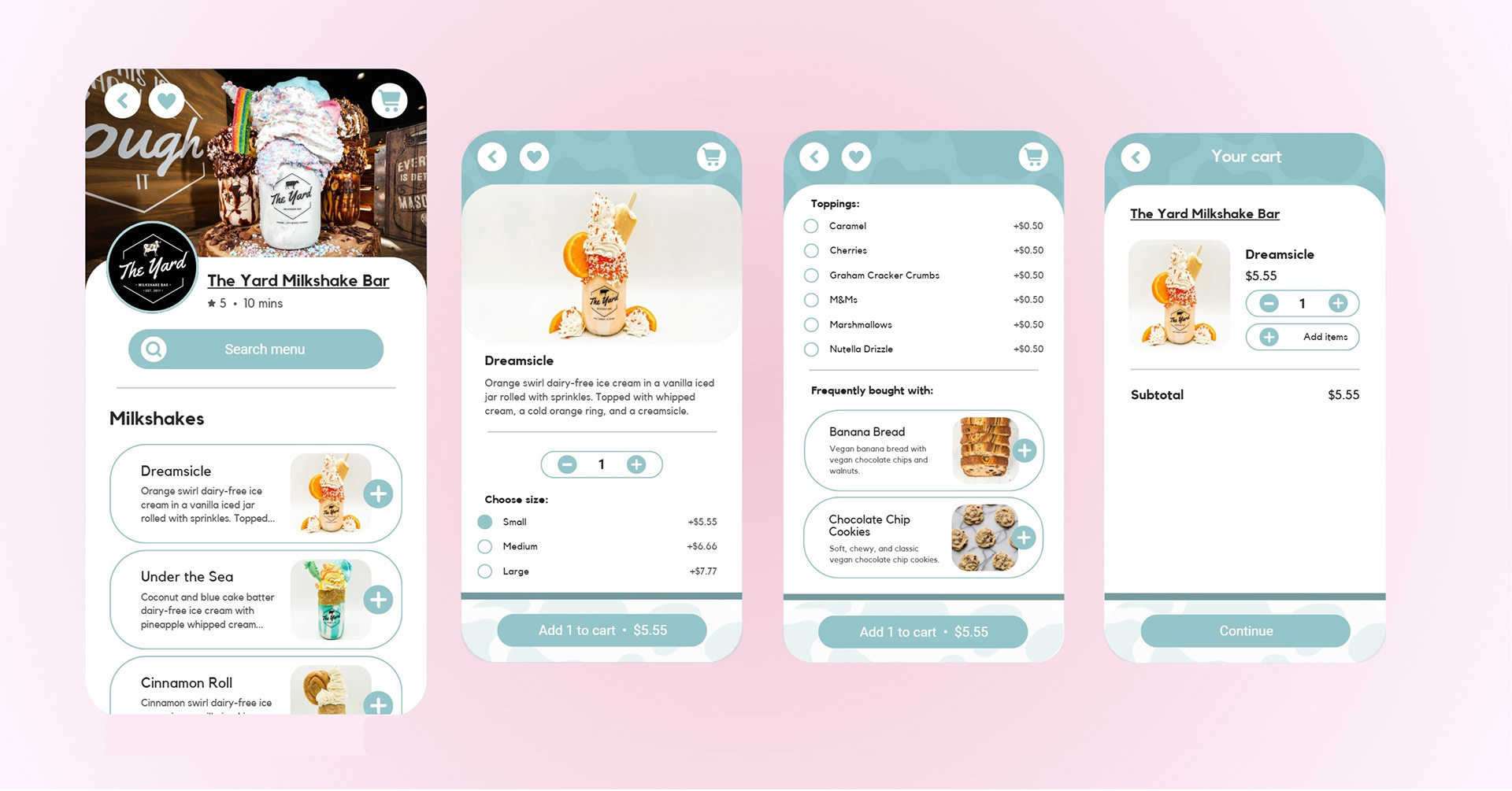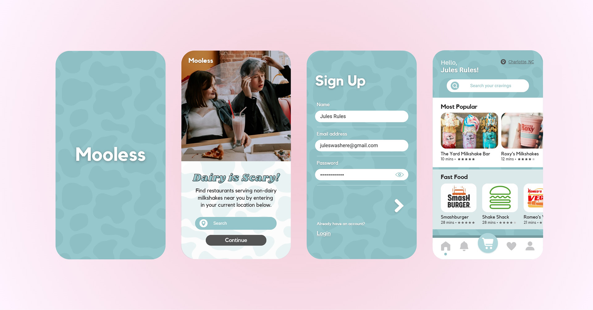 for Mooless, a conceptual mobile app designed to help users locate and order dairy-free milkshakes. The app